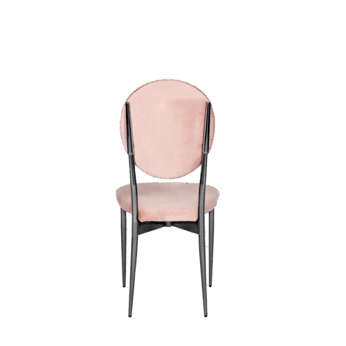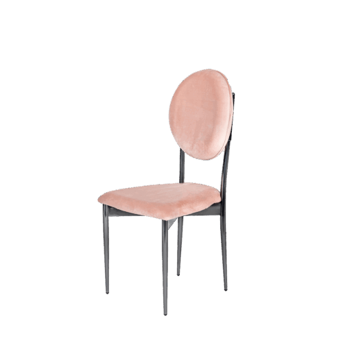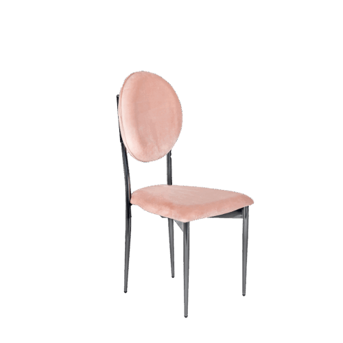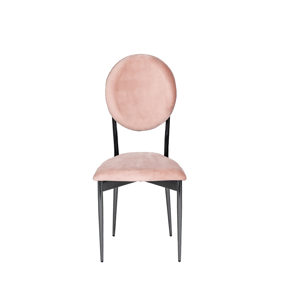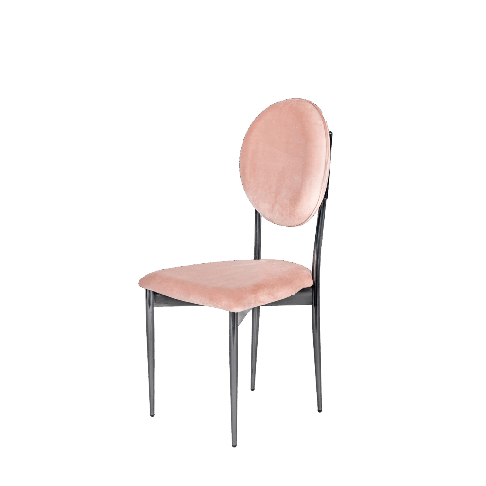 Hayworth Dining Chair with Medallion Back, Blush Velvet Upholstery and Blackened Chrome Frame.