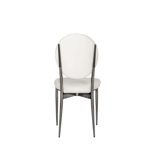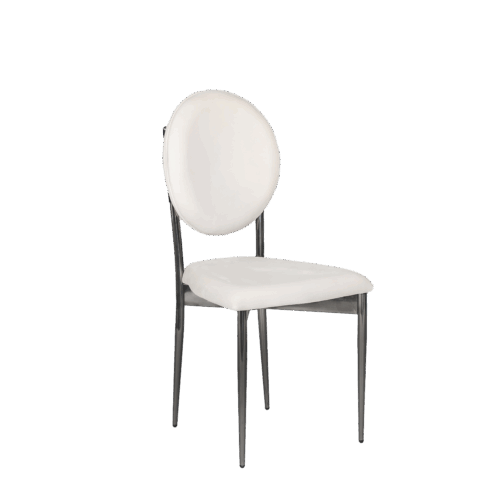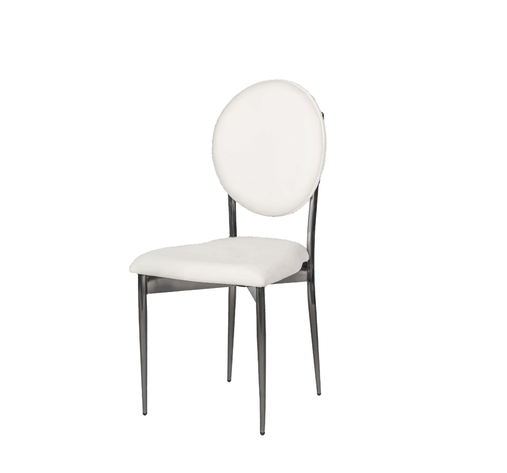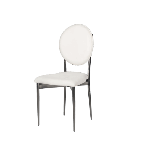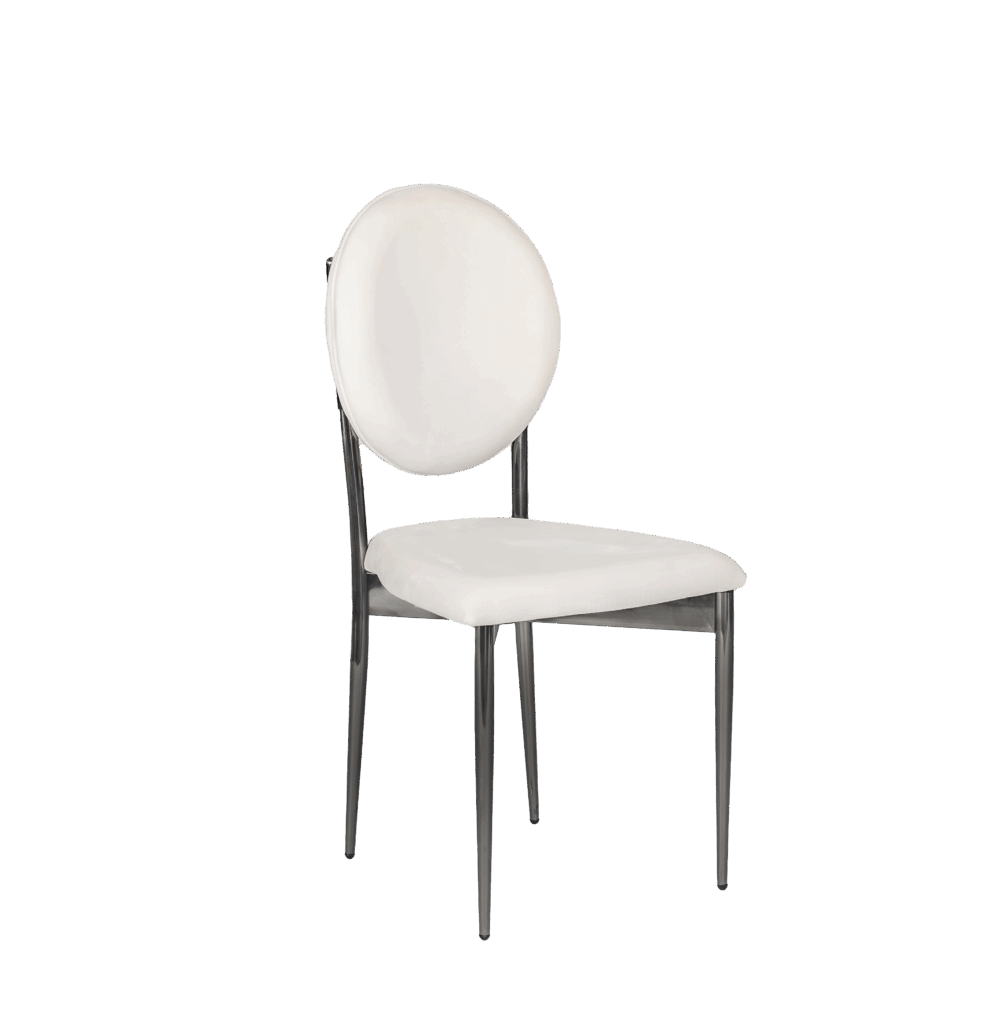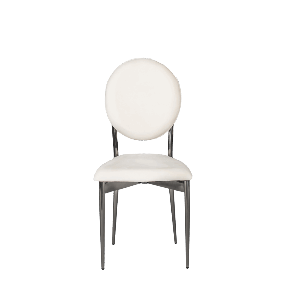 Hayworth Dining Chair with Medallion Back, White Velvet Upholstery and Blackened Chrome Frame.