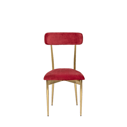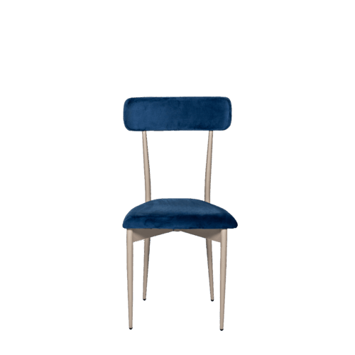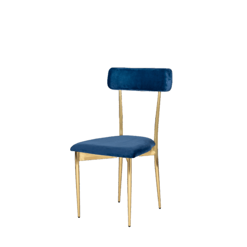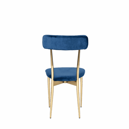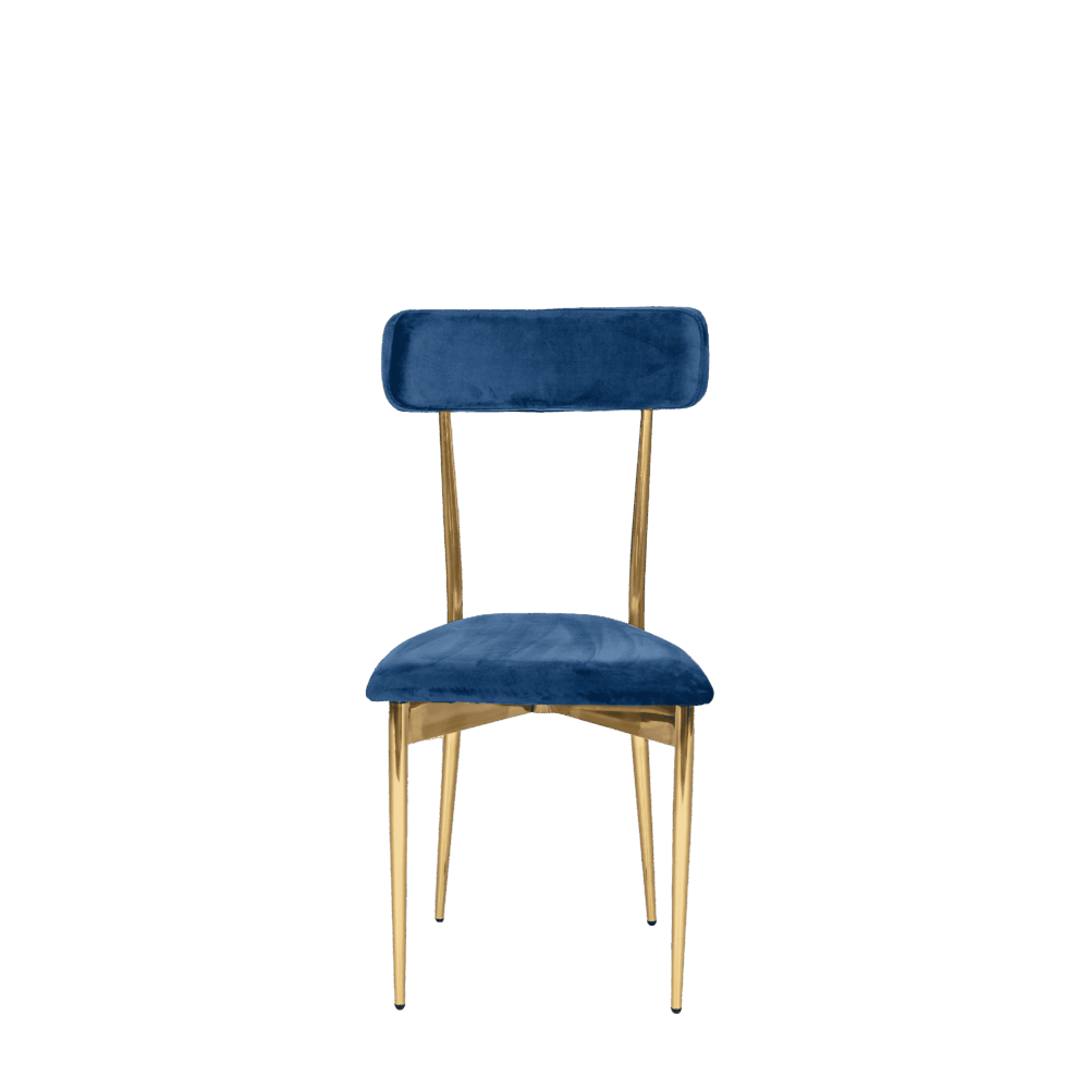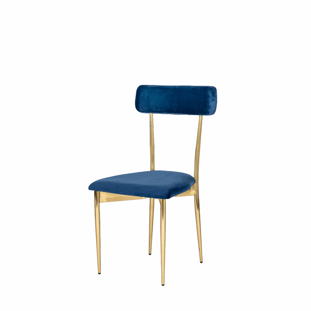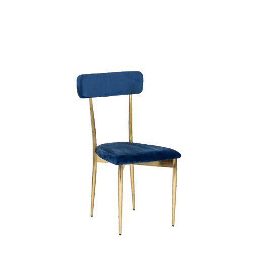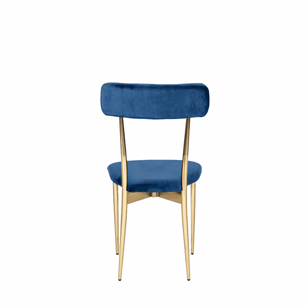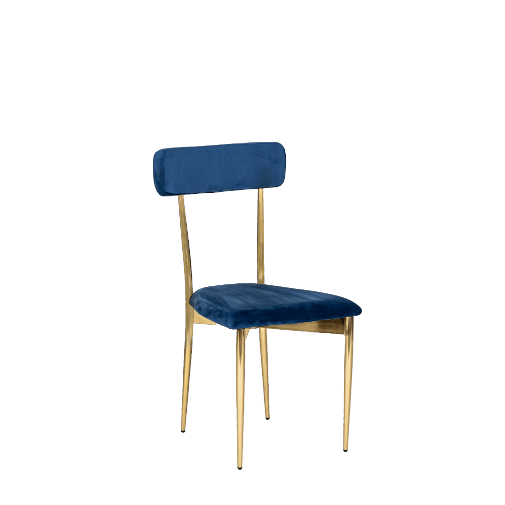Hayworth Dining Chair with Rectangular Back, Blue Velvet Upholstery and Gold Metallic Frame.